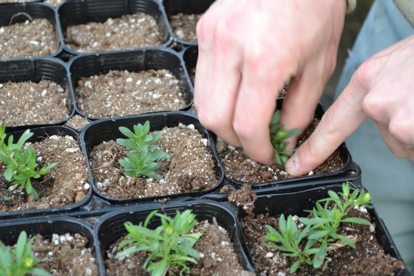 種から育てた小さな芽をポットに植えかえます。