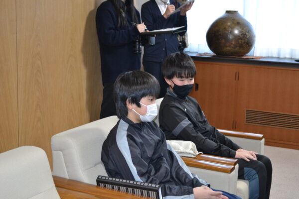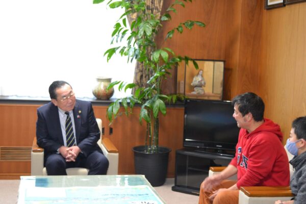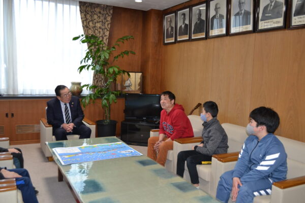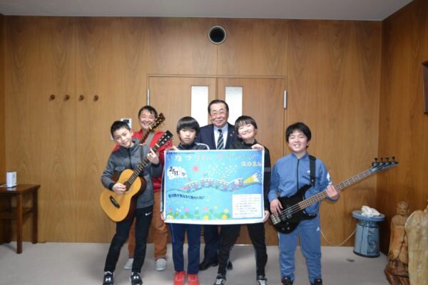 IMC(稲津ミュージッククラブ)リーダー山口健治さんとメンバーのドラ★マジックが、2月11日に行う「第15回いなつフォークvillage」のPRのため瑞浪市長を表敬訪問しました。