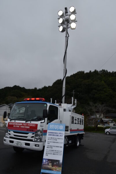 小里川ダムの照明車がまぶしいです。