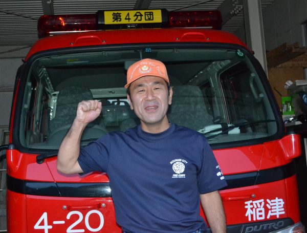20歳で稲津の消防団に入団して27年!! 今年から第四分団の分団長となられました。仕事をしながら日々の訓練、災害発生時には消火・救助・警戒などの消防活動を行っている約70名の団員を指揮されています。