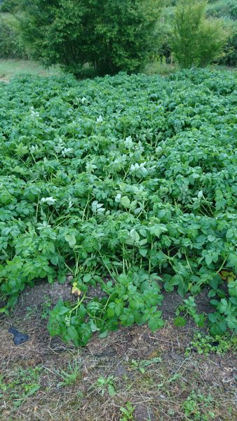 昨日の朝は青々として元気よかったジャガイモは踏まれて横たわり、悲しそうでした。