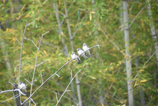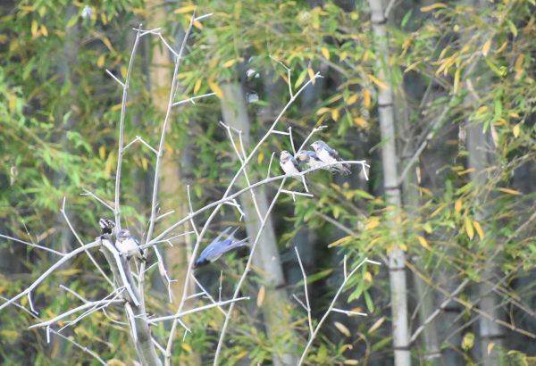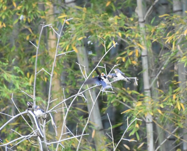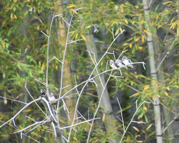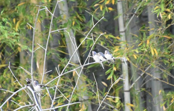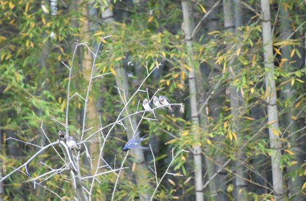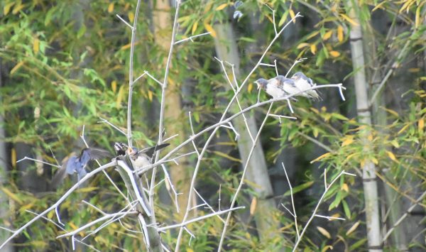 竹藪の中の枯れて折れて倒れかかった竹にツバメの兄弟?姉妹? 写真の中央わかりますか?